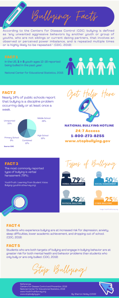 According to the CDC (2019), “Students who experience bullying are at an increased risk for depression, anxiety, sleep difficulties, lower academic achievement, and dropping out of school.