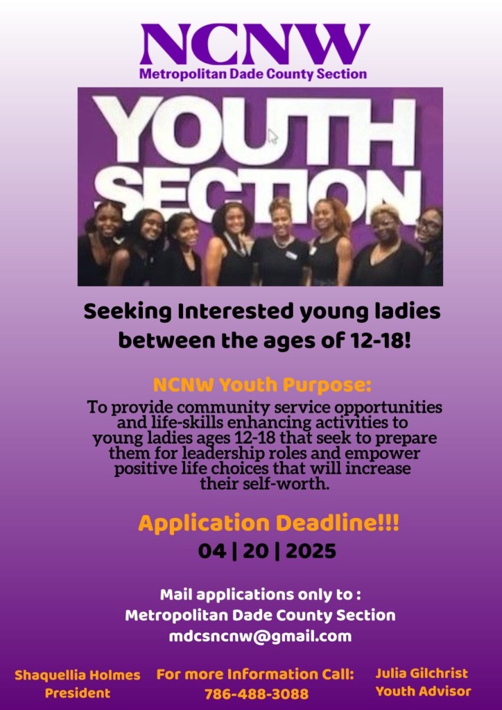 National Council of Negro Women, Inc. Metropolitan Dade County Section, Inc. is a 501(c) (3) organization. For more information send email to mdcsncnw@gmail.com